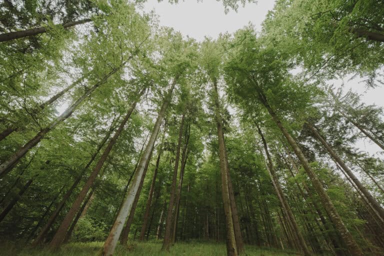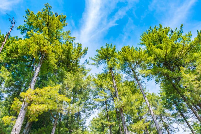 A low angle shot of a blue cloudy sky and a forest full of trees